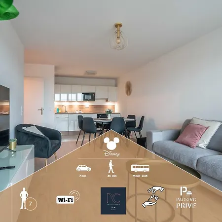 O apartamento *Disneyland-Paris* 7Pers, Wifi, Netflix, Parking oferece cozinha totalmente equipada, bem como quartos com área de estar, WiFi e TV. Disneyland Resort Paris pode ser alcançada em 5 minutos, enquanto que o aeroporto em Paris - Charles de Gaulle fica a 45 km de distância.